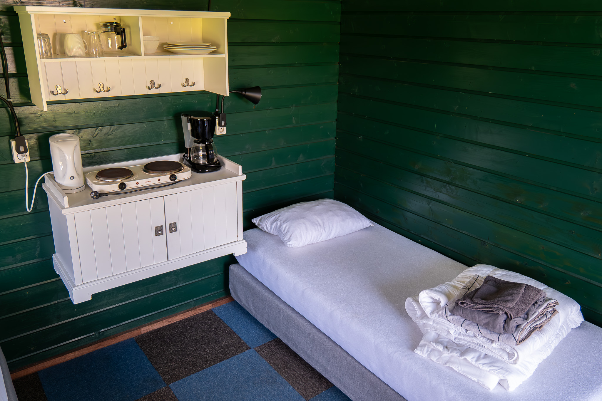 - Keuken Kleine kitchenette met kookplaat, waterkoker en basisservies